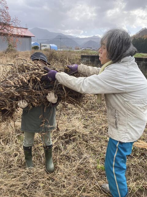 子どもたちは「大きなカブ」のイメージがあったのか、カブは1人ではなかなか抜けないと思っていたらしく、簡単に抜けると、「1人で抜けたよ!」と大喜びでした。大豆の収穫は、初めてとの事で、「これ全部抜くんですか?」と不安気味でしたが、簡単に抜ける事が分かると、どんどん抜いて、トラック迄の運び出しも、率先してやってくれた子どもたちでした。